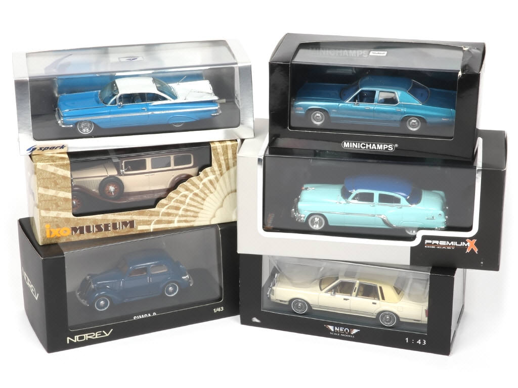 miniatures reproduisant les modèles : DODGE, PONTIAC, CHEVROLET, MERCEDES, SIMCA & LINCOLN - on y retrouve les marques : MINICHAMPS, PREMIUM X, SPARK, IXO, NOREV & NEO - un suremballage en état 'c'