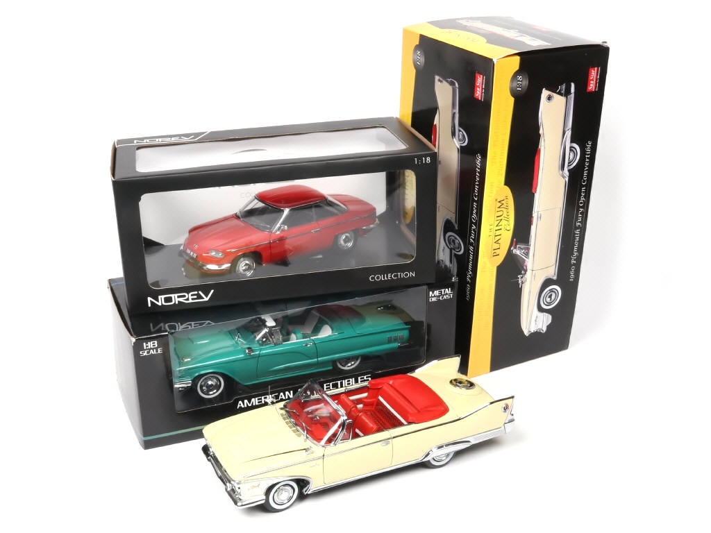 échelle 1/18ème - comprend : FORD THUNDERBIRD CONVERTIBLE 1960, PLYMOUTH FURY 160 (très léger défaut de jointure du capot-moteur, sièges poisseux) & PANHARD 24 CT - on y retrouve les marques : SUN STAR & NOREV
