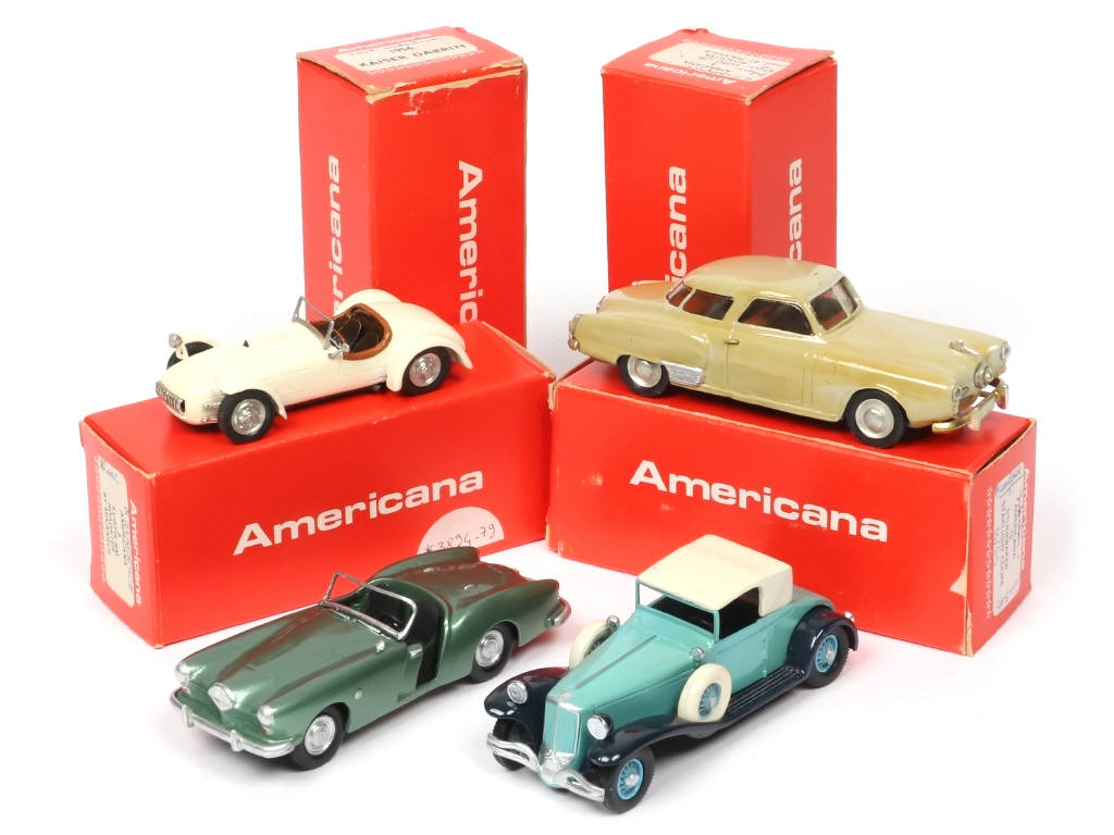 série 'AMERICANA' - comprend : STUDEBAKER STARLIGHT (carrosserie vernissée), CORD L29, KAISER DARRIN & KURTIS 500 (un phare cassé à recoller) - annotations & étiquettes collées sur les boîtes