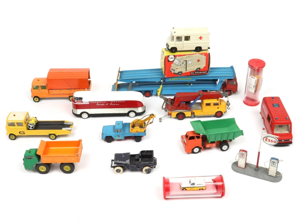 comprend notamment les modèles : MERCEDES, RENAULT, JEEP & MAGIRUS - on y retrouve notamment les marques : DINKY TOYS, SIKU, NOREV & FRANCE JOUETS - avec quelques manques & parties cassées