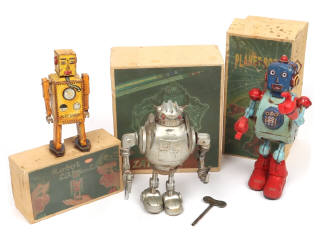 hauteur du plus grand 23 cm - moteurs à clef (fonctionnent - 2 clefs présentes) - fabrication en acier vieilli (avec oxydation donnant un air plus ancien à ce type de jouets) - avec parties déformées - boites avec taches (un couvercle en état 'c')