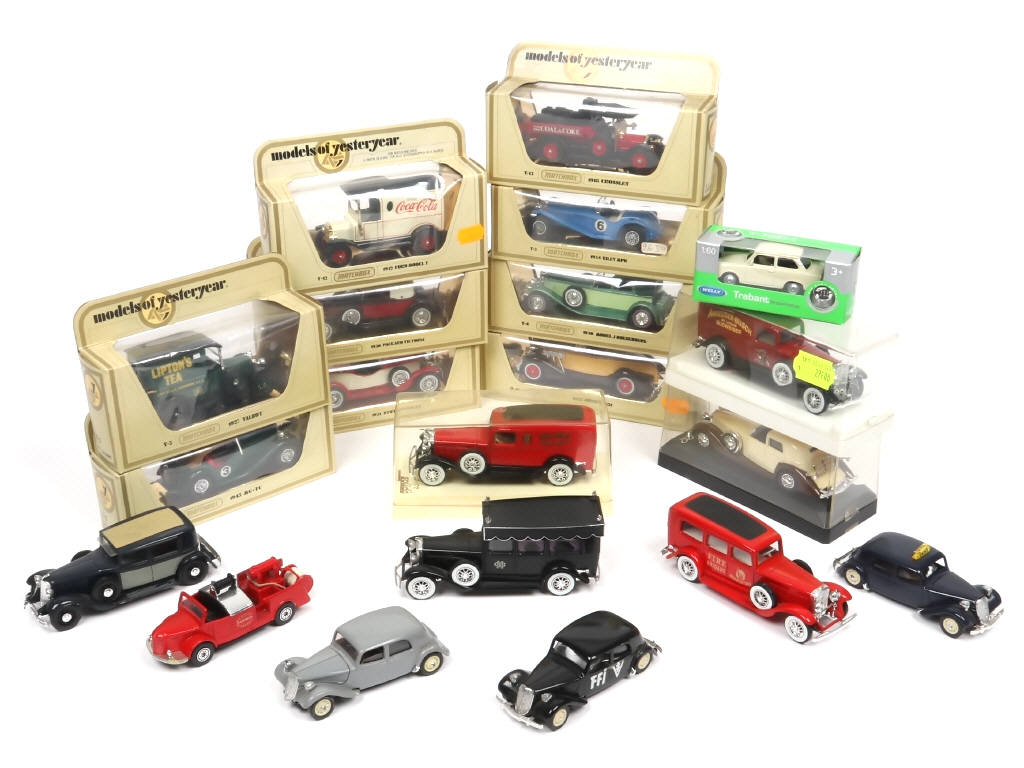 comprend notamment les modèles : FORD, DUESENBERG, RILEY, CADILLAC & RENAULT - on y retrouve les marques : MATCHBOX, WELLY & SOLIDO - quelques manques & parties cassées - boites en états 'b' & 'c' (7 modèles sans)