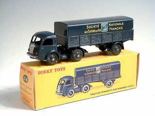 DINKY TOYS (FRANCE) 32AB PANHARD Semi-remorque 'S.N.C.F' (version avec intérieur de toit quadrillé) bleu foncé (fond de l'écusson uni)