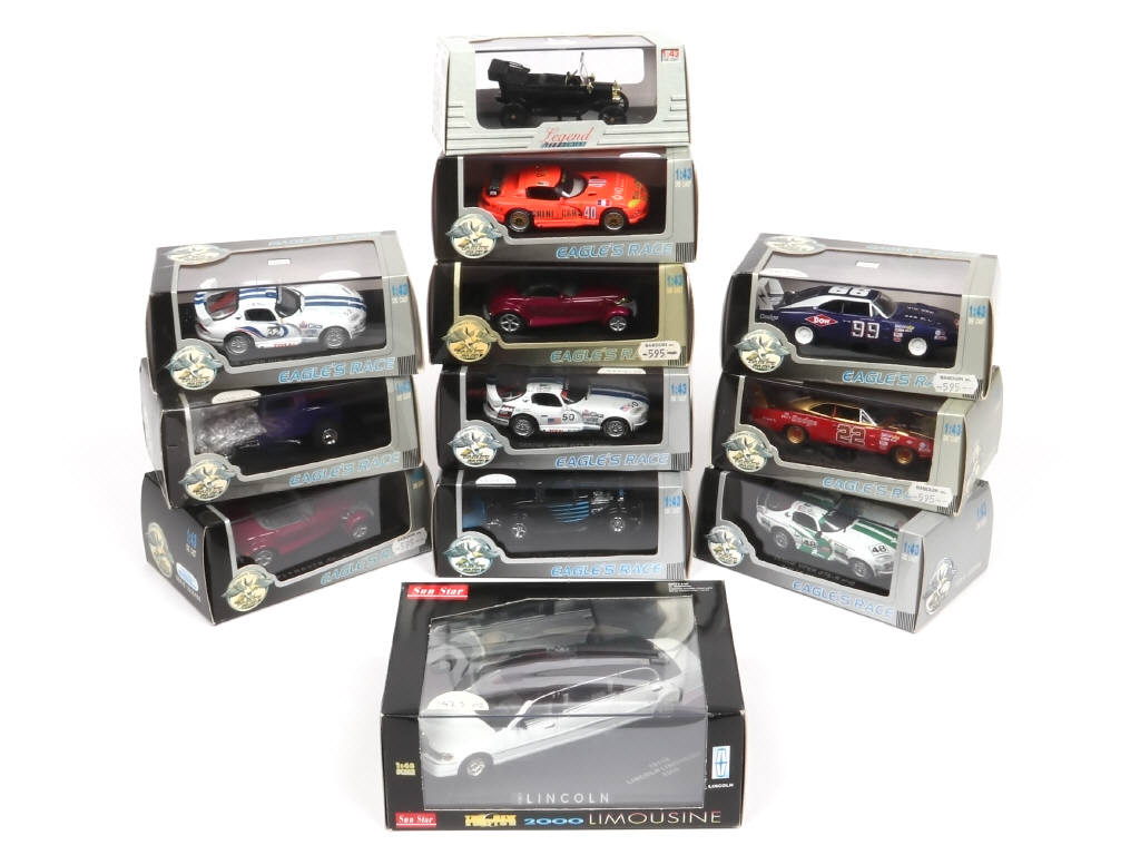 comprend notamment les modèles : PLYMOUTH, DODGE & FORD - on y retrouve les marques : SUN STAR & UNIVERSAL HOBBIES - quelques étiquettes sur les boites