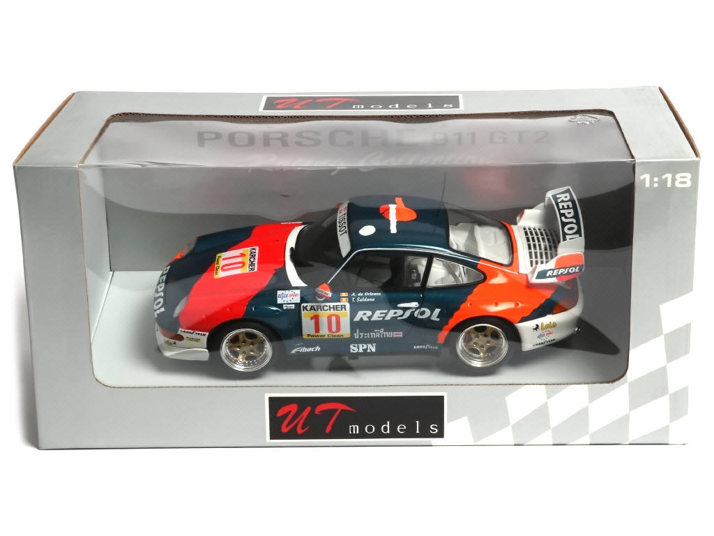 UT MODELS (HONG KONG) 39632 PORSCHE 911 GT2 1996 bleu métallisée, rouge & orange