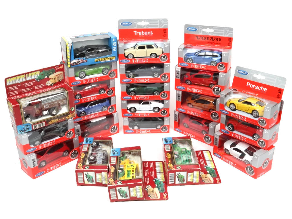 comprend notamment les modèles : TRABANT, VOLVO, PORSCHE & LAMBORGHINI - on y retrouve les marques : WELLY (principalement) & MAISTO - 3 boites avec accrocs & frottements