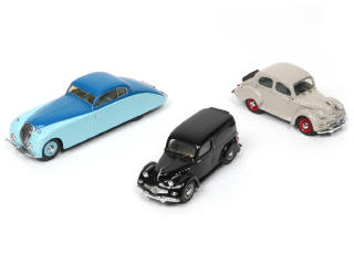 réalisation en métal - comprend : PEUGEOT 601 DL 1935, PANHARD DYNA X 86 1953 & DYNA X (quelques petites traces de colle sur le vitrage)