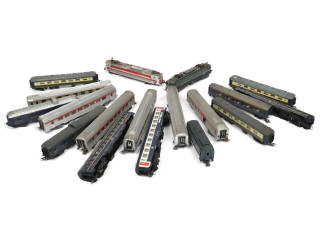non testé - comprend notamment : wagon-lits CIWL, motrice & voitures-voyageurs - on y retrouve les marques : TROBY, GEGE, JOUEF & LIMA - plus ou moins encrassées - quelques manques & parties cassées - quelques petites traces d'oxydation sur certains exemplaires