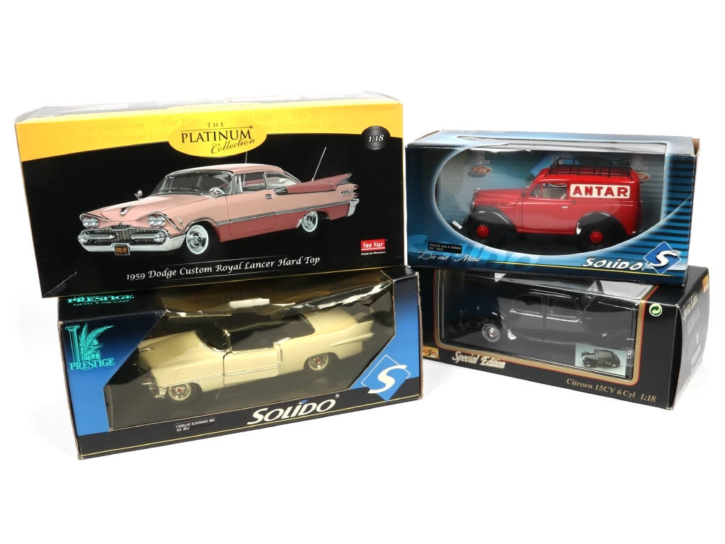 échelle 1/18ème - comprend les modèles : RENAULT, CITROEN, CADILLAC & DODGE - on y retrouve les marques : SOLIDO, MAISTO & SUN STAR - un blister jauni & déchiré
