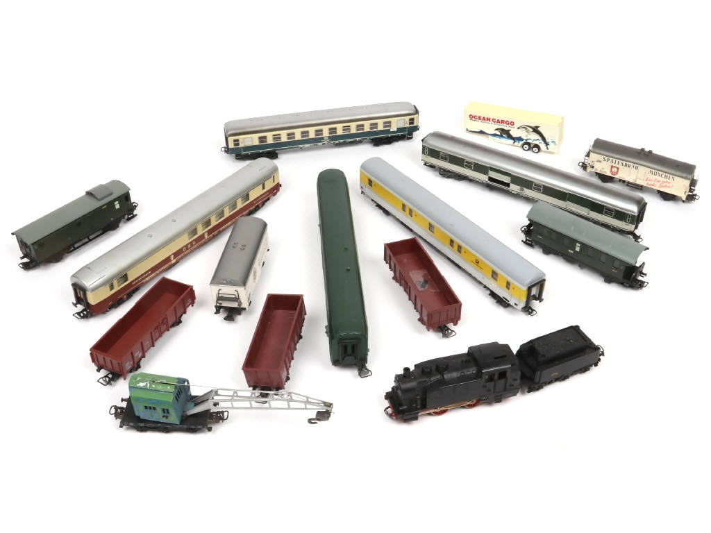 comprend : locomotive à vapeur (non testé), tender, voitures-voyageurs & wagons-marchandises - avec manques & parties cassées - on y retrouve notamment les marques : MÄRKLIN & JOUEF - on y joint une semi-remorque