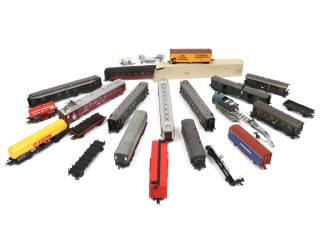 non testé - comprend notamment : voiture restaurant, wagon citerne, grue & fourgon - on y retrouve les marques : ROCO, FLEISCHMANN, BACHMANN, ELECTROTREN & JOUEF - avec manques & parties cassées