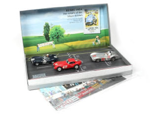voitures de circuit (non testées) - dimensions du coffret : 45x23 cm - collection 'MERCEDES-BENZ' - série limitée numérotée 381/400 exemplaires - contient : MERCEDES W196 & un sachet contenant différents décors - on y joint une FERRARI & une JAGUAR de la marque CARRERA