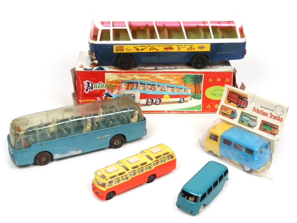un modèle jamais sous sachet jamais ouvert - différentes compositions - longueur du plus grand : 37 cm - 4 modèles avec moteurs à friction (3 fonctionnels dont un poussivement) & un autre non testé - on y retrouve notamment les marques : METTOY (système lumineux non testé), INGAP & BERNABEU GISBERT (boite en état 'c') - traces d'oxydation