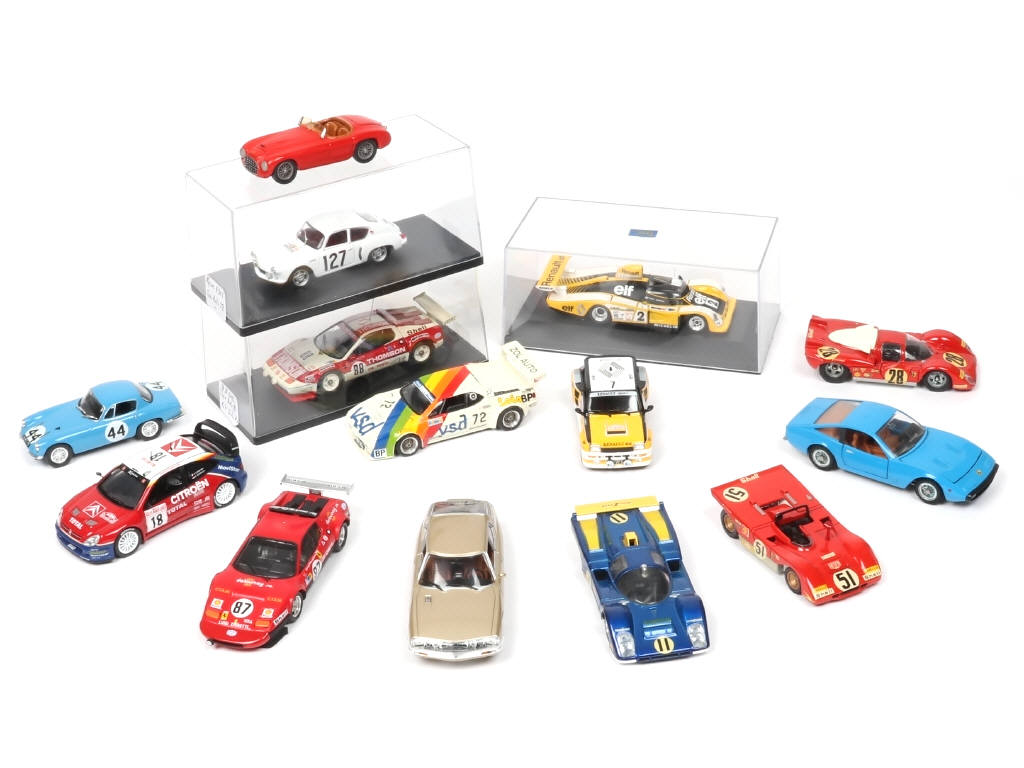 miniatures reproduisant les modèles : CITROËN, FERRARI, RENAULT, BMW, LOTUS & ALPINE - on y retrouve notamment les marques : MEBETOYS, UNIVERSAL HOBBIES & SOLIDO (modèles transformés dont certains plus ou moins repeints) - 3 exemplaires avec boîte non d'origine - quelques petits accessoires cassés, manquants & parties retouchées (plus ou moins importants suivants les modèles)