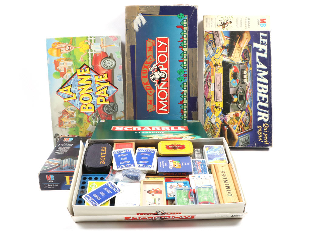comprend notamment : LE FLAMBEUR, MONOPOLY, LA BONNE PAYE & HOTEL - avec manques & parties cassées - les boites sont en états 'b à 'd', certaines déchirées et/ou réparées avec du ruban adhésif