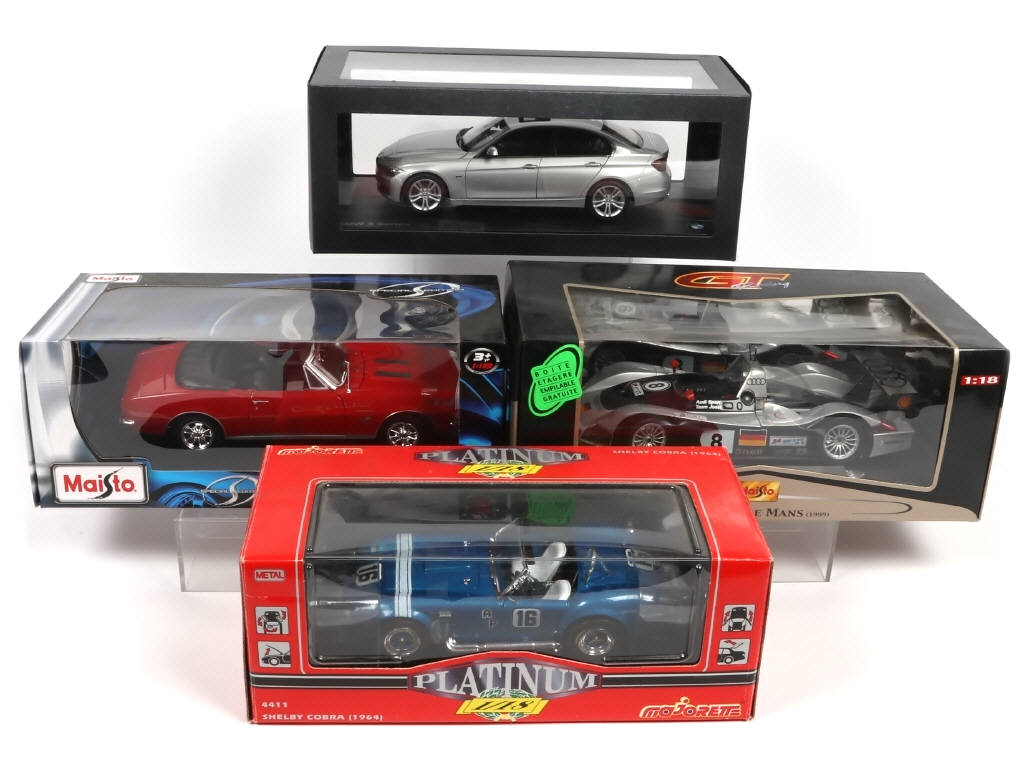 comprend notamment les marques : MAJORETTE & MAISTO - on y retrouve les modèles : AUDI R8R LE MANS, CHEVROLET CAMARO SS 396 CONVERTIBLE (1967), SHELBY COBRA (1964) & BMW SERIES 3 - boîtes légèrement encrassées & déformées