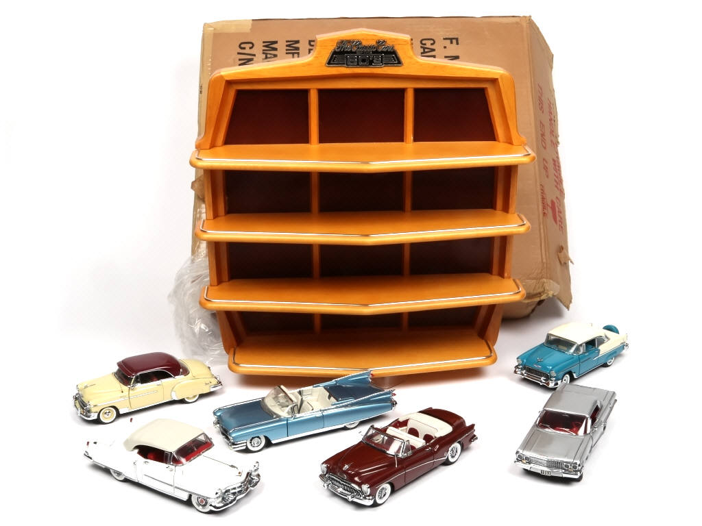 échelle 1/24ème - comprend les modèles : CHEVROLET, CADILLAC & BUICK - un coffre désolidarisé de la carrosserie (à recoller) & une antenne manquante - on y joint un présentoir à suspendre pour modèles en 1/43ème avec suremballage cartonné (en état 'c') & cale en polystyrène