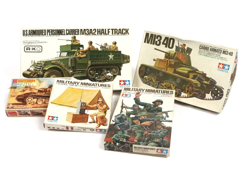 comprend les marques : TAMIYA & MATCHBOX- on y retrouve notamment les modèles : MI3/40 & US ARMOURED PERSONNEL CARRIER - semblent complètes avec notices - boîtes légeremment déformées