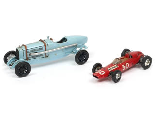 créations artisanales en bois - comprend notamment : B.R.M 1500 cm3 V8 MONZA 1965 (quelques traces de colle visibles sur les essieux) - un exemplaire avec une roue cassée & manquante (carrosserie avec traces d'humidité)