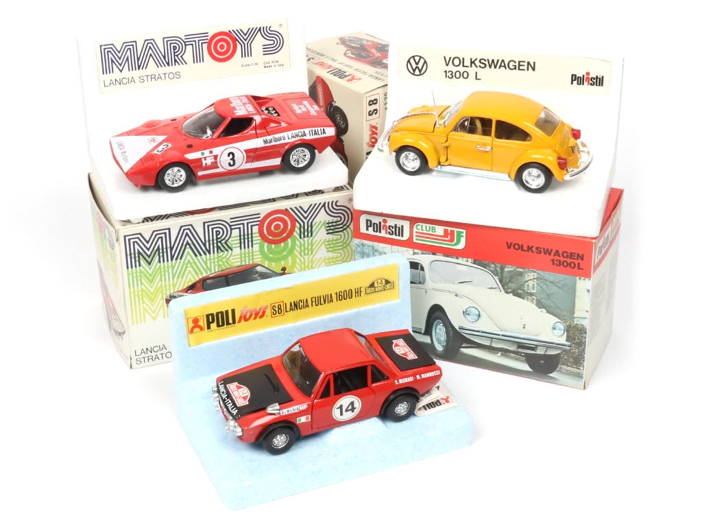 échelle : 1/25ème - miniatures reproduisant les modèles : VOLKSWAGEN & LANCIA - on y retrouve les marques : POLISTIL, MARTOYS & POLITOYS - quelques accrocs sur les boîtes dont une avec manques de papier