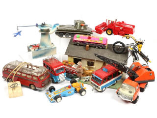 fabrication en tôle pour la plupart - comprend notamment les marques : TONKA, BRITAINS & FRANCE JOUETS - on y retrouve les modèles : char, grue, formule 1, autobus & moto - on y joint une ferme avec quelques animaux, un jouet mécanique à balancier avec avions - possibilités de petits manques, parties cassées & petites traces d'oxydation