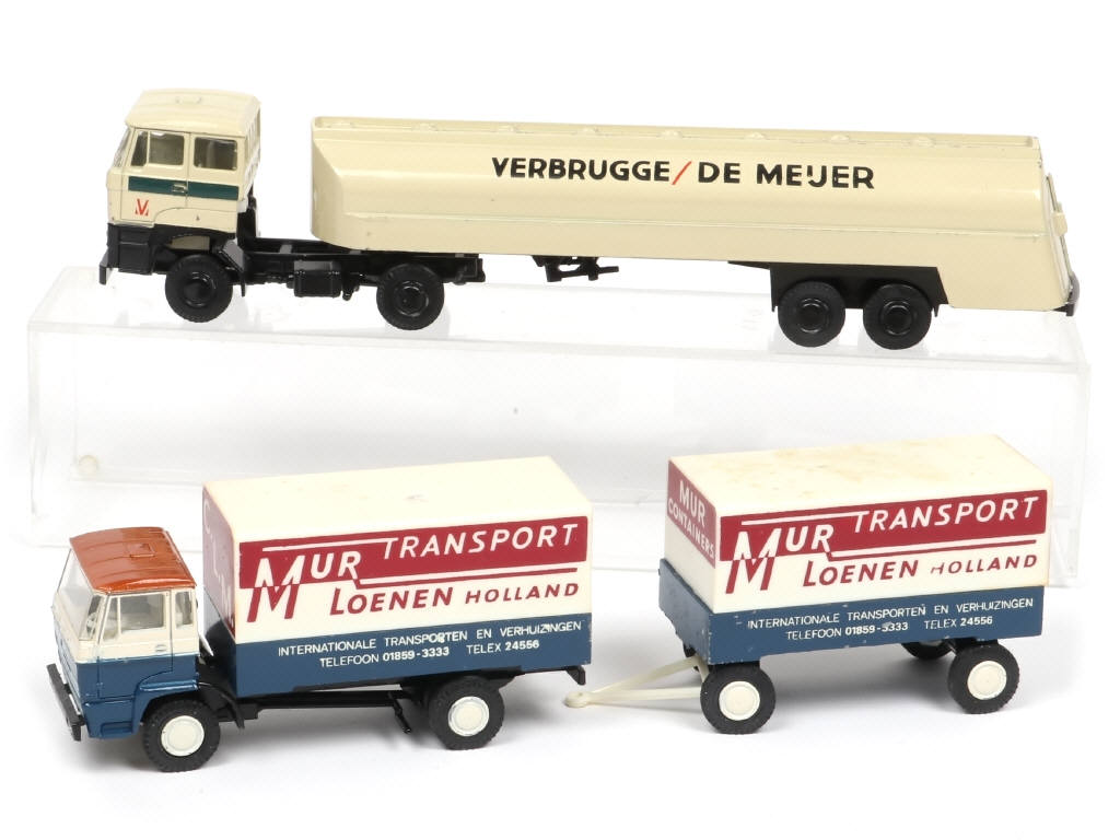 comprend : 3300 semi-remorque citerne 'VERBRUGGE/DE ME'JER (manque cheminée) & 2800 fourgon bâché avec remorque bâchée 'TRANSPORT LOENEN HOLLAND' (traces d'humidité sur les bâches) - micro-éclats par endroits, frottements & éclats plus importants sur les remorques