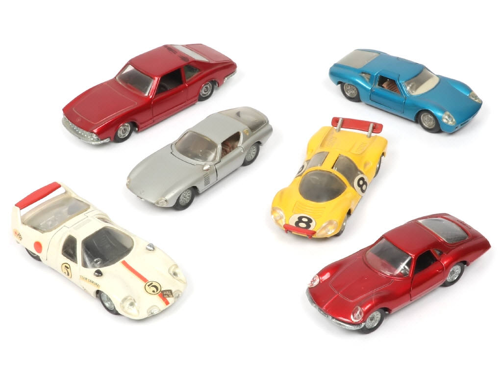 miniatures reproduisant les modèles : FORD-LOLA, ALFA ROMEO GIULIA 1600 (2 exemplaires différents), SAMURAI, GHIA V 280 (frottements sur l'arrière du toit) & FERRARI DINO - ensemble légèrement encrassé