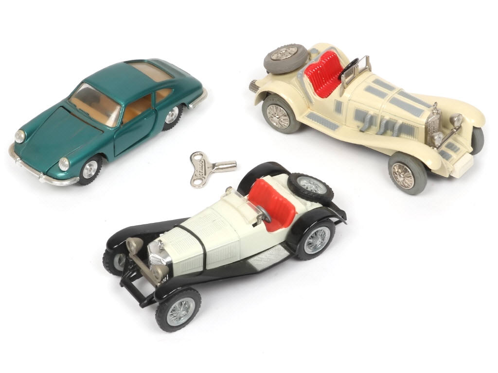 miniatures reproduisant les modèles : MERCEDES & PORSCHE - on y retrouve les marques : GAMA & SCHUCO (modèle original, moteur à clef fonctionne, avec clef)