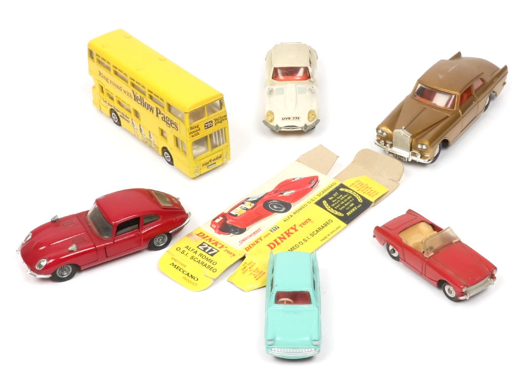 miniatures reproduisant les modèles : ATLANTEAN, AUSTIN, FORD, JAGUAR & ROLLS ROYCE (traces de papier bulle sur le toit avec frottements) - on y joint une boîte vide (état 'b', froissée) de la référence 217 & JAGUAR TYPE E de la marque CORGI TOYS (défauts de peinture sur la carrosserie par endroits avec un éclat majeur sur le toit) - ensemble plus ou moins encrassé