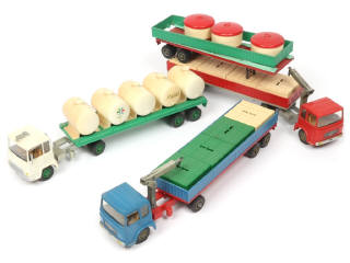 comprend : SAVIEM SM300 (2 exemplaires, bras de grues ternis) & BERLIET - jantes légèrement fondues - on y joint une semi-remorque de la marque en état 'c' avec éléments manquants - ensemble plus ou moins encrassé
