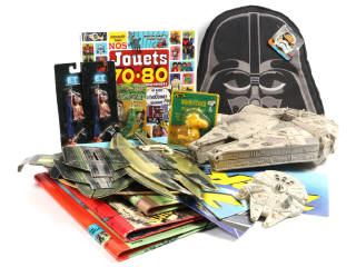 comprend notamment : le faucon millenium MICRO MACHINES, 2 figurines E.T L'EXTRATERRESTRE, un coussin DARK VADER & le livre NOS JOUETS 70.80 (possibilité de manques & parties cassées)