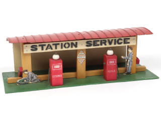 dimensions : 34 x 14 x 10,5 cm - avec 2 garagistes en carton (petits manques de papier sur un exemplaire, sans tuyau) - retouches d'usine sur l'arrière du mur - très léger manque sur un globe de pompe - TRES BEL ETAT !