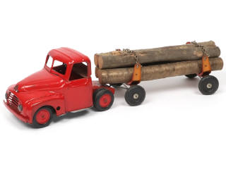 longueur 44 cm - avec moteur à clef (fonctionne) & chargement de 5 grumes - 2 jantes légèrement fendues - quelques traces d'oxydation par endroits (phares & sigle de capot-moteur ternis)