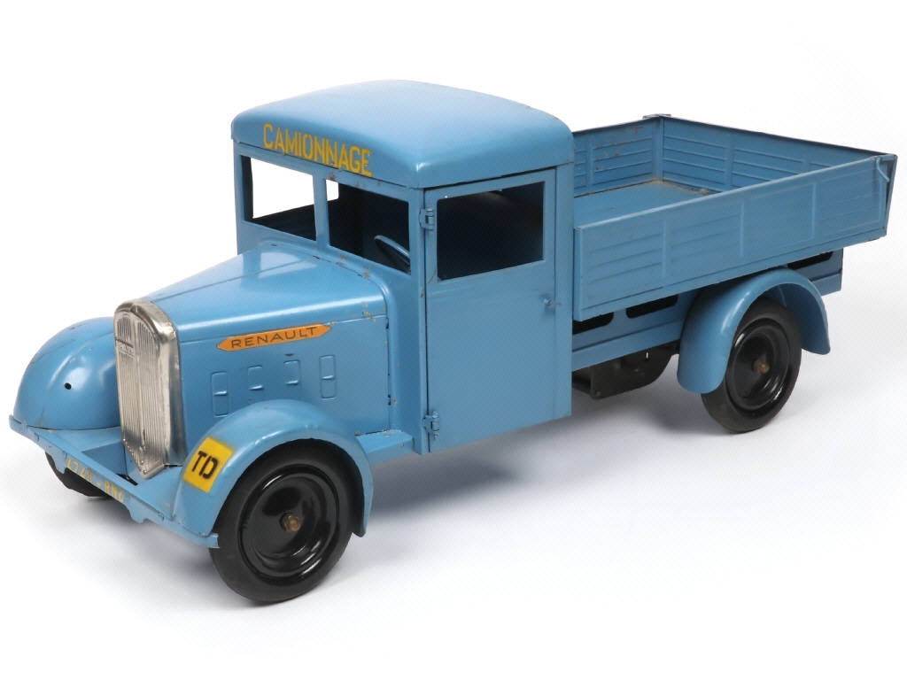 longueur : 43 cm - avec moteur à clef (fonctionne), portière conducteur ouvrante, ridelle arrière basculante & direction (sans phare électrique ni accessoire) - inscriptions au pochoir 'CAMIONNAGE' (en lettres jaunes) sur le fronton de cabine, 4748-RNG sur l'arrière du plateau, le pare-chocs avant & 'TD' sur l'aile avant gauche (frottements sur celle de droite) - traces d'oxydation (petites taches, décoloration) par endroits principalement sur la ridelle arrière
