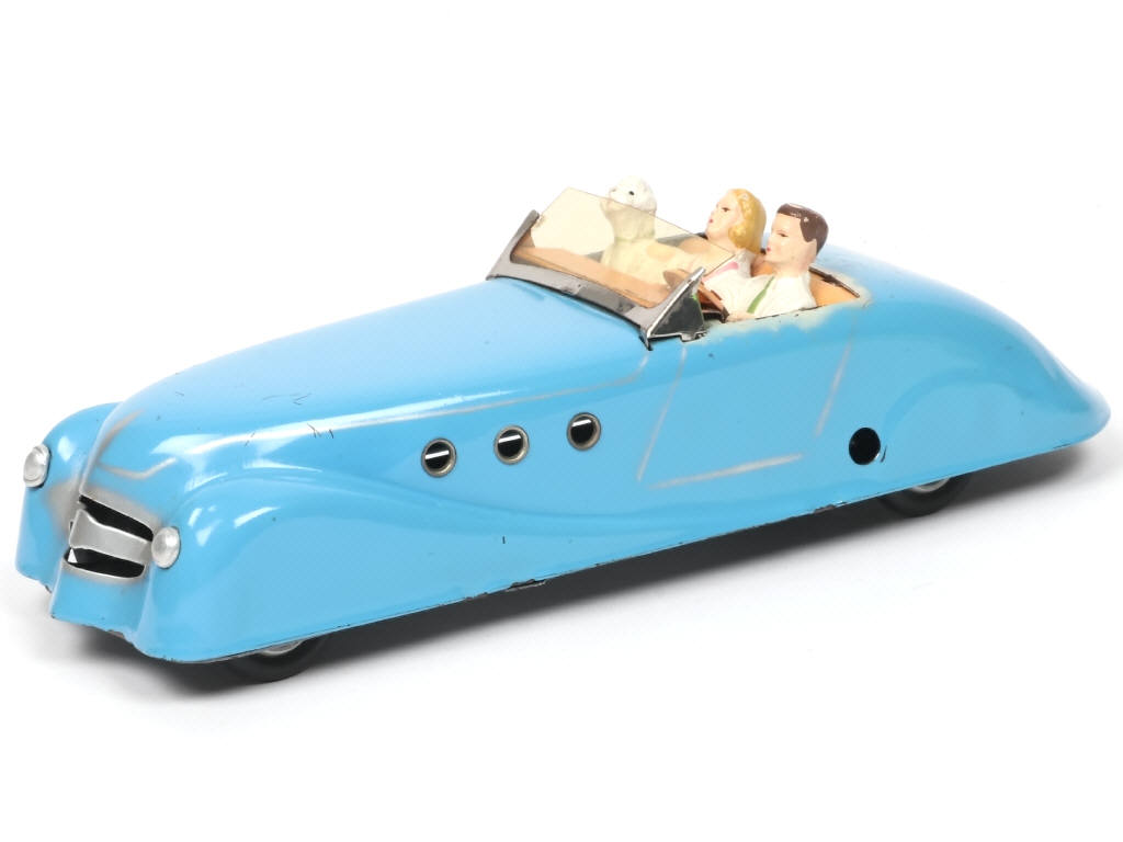 longueur 22,5 cm - version de 1954 avec moteur à clef (fonctionne), 2 personnages & un caniche - petites traces d'humidité sur le pourtour gauche de l'habitacle (décoloration) - manques de peinture sur le volant - un optique de phare légèrement endommagé