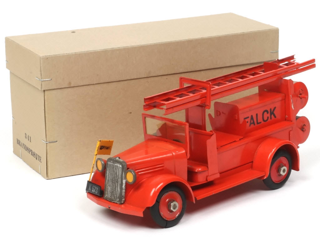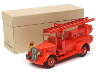 longueur 17,5 cm - réalisation en tôle - avec 2 dévidoirs (tuyaux séchés) & 2 échelles - quelques petits frottements & légères déformations par endroits - calandre & phares ternis - pneus séchés, craquelés & plus ou moins affaissés - manque 2 dévidoirs - on y joint une boîte de rangement non d'origine