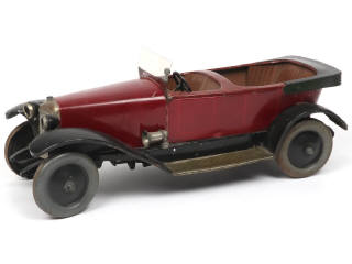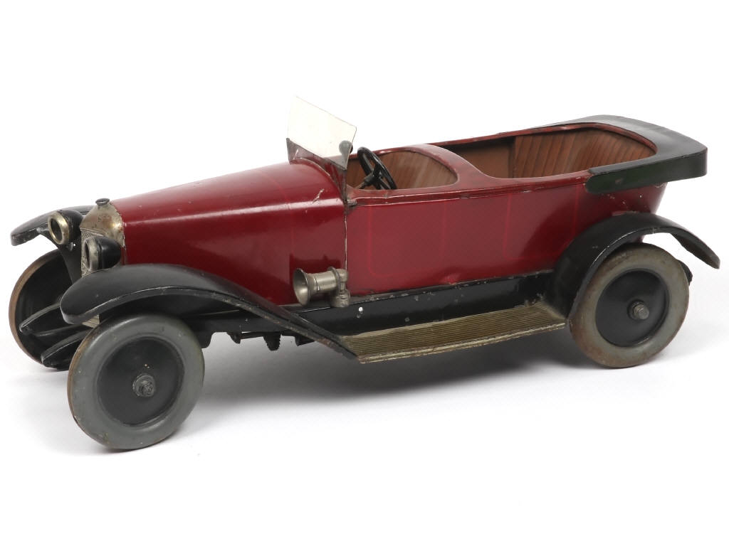 longueur 34 cm - avec moteur à clef (à revoir), commande de marche/arrêt au plancher & direction par le volant - avec plaques minéralogiques numérotées 7391- parties noires plus ou moins repeintes (quelques craquelures) & retouches par endroits - importants manques de peinture sur le support de pare-brise (non d'origine pour ce dernier) - quelques petits manques - une fixation de roue restaurée