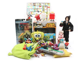 comprend notamment : figurine TERMINATOR 2, casque lumineux DARTH VADER, figurine HARRY POTTER (33 cm), montre SHERK & jouets de FAST FOOD - avec manques & parties cassées