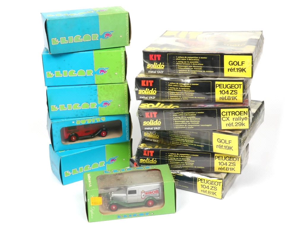 miniatures reproduisant les modèles : CITROËN, FORD, VOLKSWAGEN & PEUGEOT - on y retrouve les marques : ELIGOR & SOLIDO (kits à monter, jamais ouvert) - boîtes plus ou moins encrassées, tachées & déformées