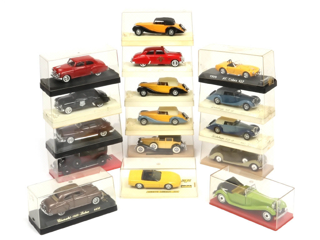 collection 'AGE D'OR' - comprend notamment les modèles : DELAHAYE, AC COBRA, CHEVROLET, CHRYSLER & CORD (manque sigle de calandre) - on y joint 2 modèles de la marque RIO - quelques modèles sans fixation de socle (avec parties fondues) - quelques boites encrassées & couvercles avec fêlures