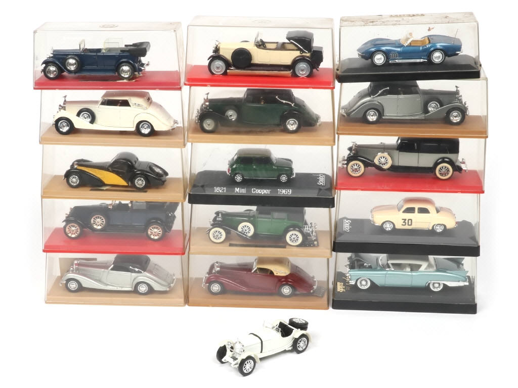 miniatures reproduisant notamment les modèles : FIAT (manque personnages), ROLLS ROYCE, RENAULT, MERCEDES (un exemplaire sans boîte) & BUGATTI - boîtes plus ou moins jaunies & encrassées (états 'b' & 'c', quelques fixations manquantes & boîtes non conformes) - on y joint un modèle de la marque VITESSE