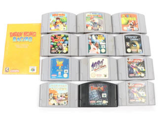 jeux en français - testés : fonctionnent - comprend : YANNICK NOAH, RE VOLT, MARIO KART 64 (étiquette avec accrocs & décolorée), PERFECT DARK, MARIO TENNIS, DIDDY KONG RACING (avec mode d'emploi), BUST A MOVE 3 DX, TOY STORY 2, STAR WARS RACER, 1080 SNOWBOARDING & TUROK 2 - cartouches plus ou moins encrassées