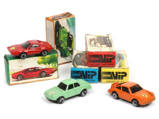 petite échelle - comprend : MERCEDES 450 SEL (sans boite), FERRARI 308 GTB, PORSCHE 911 TURBO, LANCIA STRATOS, ROLLS ROYCE SILVER SHADOW & JAGUAR JX 4.2 - 2 modèles avec décalques légèrement décollés & altérés - quelques accrocs sur les boites