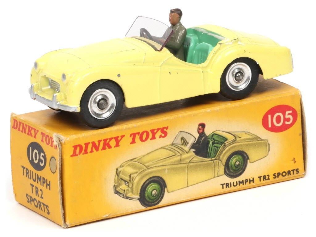 DINKY TOYS (GB) 105 TRIUMPH TR2 jaune citron, intérieur vert clair, jantes aluminium