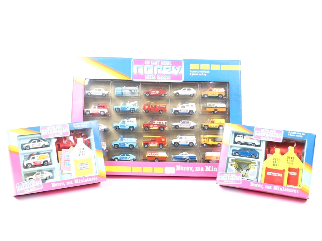 NOREV, MA MINIATURE - 2 coffrets avec véhicules, accessoires & bâtiments reproduisants une station SHELL, un cabinet MEDECINS DE NUIT & un coffret avec 24 véhicules (pompiers, bâteau, police FRANCE TELECOM & travaux)
