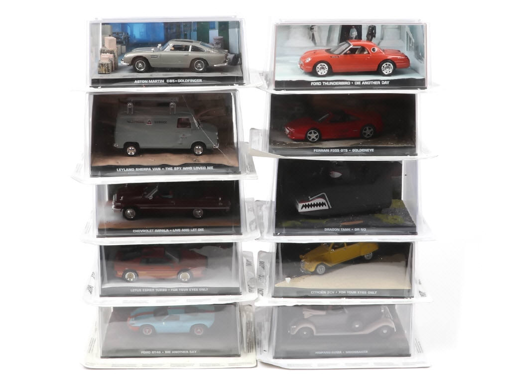 comprend notamment les modèles : FORD THUNDERBIRD "DIE ANOTHER DAY", DRAGON TANK "DR NO", CITROËN 2CV "FOR YOUR EYES ONLY", HISPANO-SUIZA "MOONRAKER" & FORD GT40 "DIE ANOTHER DAY"