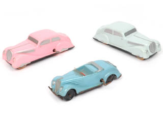 réalisation en celluloïd - comprend : 2 coupés (longueur 14,5 cm, moteurs à ressort fonctionnent, roues en buis, traces d'oxydation sur un remontoir) & cabriolet (longueur 13 cm, état 'B', moteur à ressort à revoir, une petite perforation sur l'arrière de la carrosserie, importants manques de peinture sur le plancher, en tôle pour ce dernier, quelques traces d'oxydation) - carrosseries légèrement encrassées