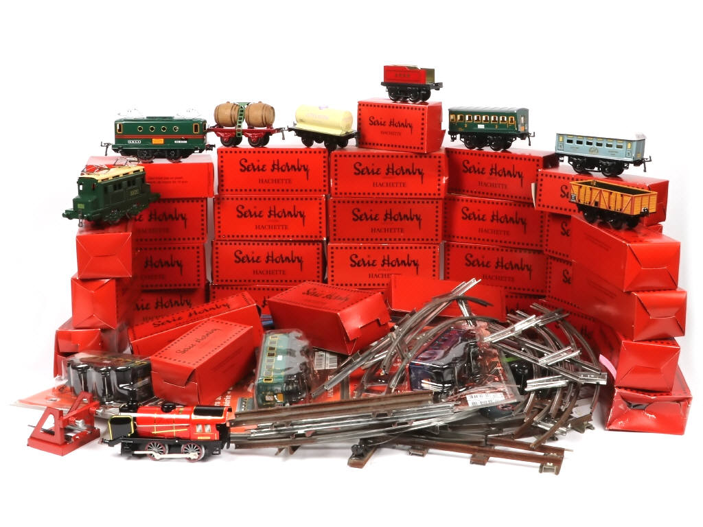 rééditions - LA GRANDE AVENTURE DU TRAIN - comprend notamment les modèles : LA VOITURE EST 3ème CLASSE HORNBY, LA VOITURE VOYAGEURS SNCF HORNBY SERIE "M", LA WAGON-CITERNE VERT, rails droits & rails courbes - 5 modèles sous blister dont un ouvert) - boîtes en états 'b à c' (légeremment déformées pour certains modèles) - possibilités de petits manques, parties cassées & petites traces d'oxydation