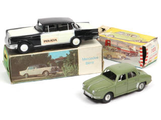 avec moteurs à friction (fonctionnent) - comprend : MERCEDES 'POLICIA' & RENAULT DAUPHINE (fixations de plancher cassées à recoller - oxydation sur le moteur & le plancher - une fêlure d'environ 10 mm sur l'aile arrière droite) - vitrages à recoller (avec parties cassées) - on y retrouve les marques : COMANDO & RICO - boites en états 'd' & 'e'