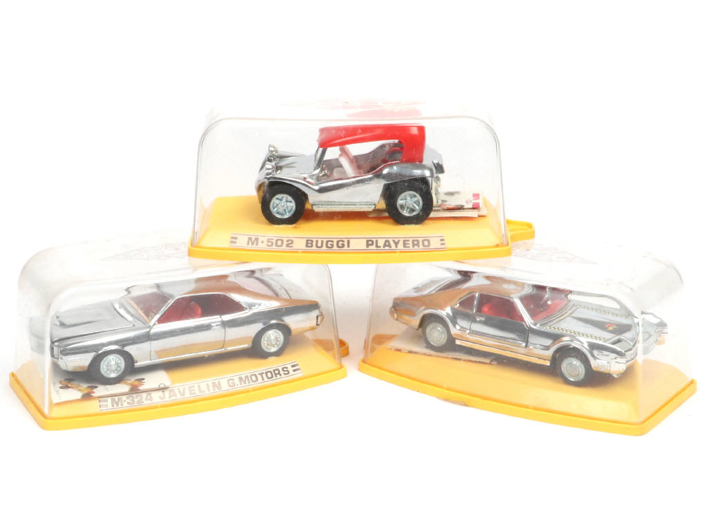 avec dépliants présentant les modèles de la marque - comprend : OLDSMOBILE TORONADO, BUGGI PLAYBOY & JAVELIN G.MOTORS - quelques parties fondues sur certains socles (réaction avec pneus)